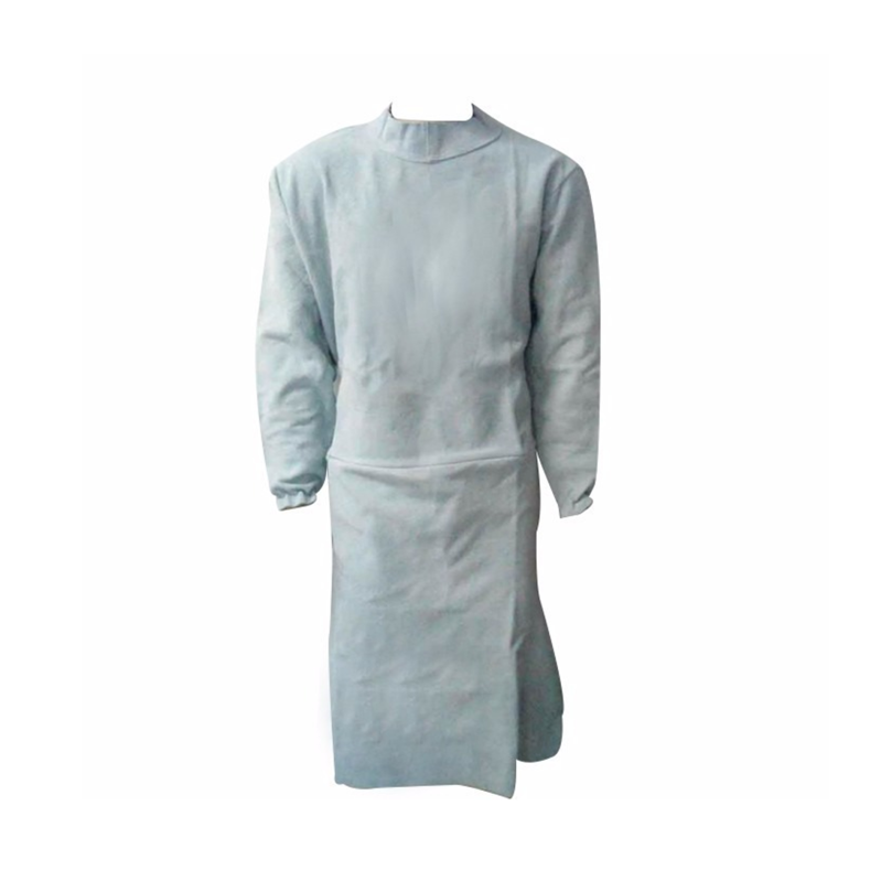 Avental de segurança confeccionado em raspa, tipo barbeiro, com mangas e elástico para ajuste.