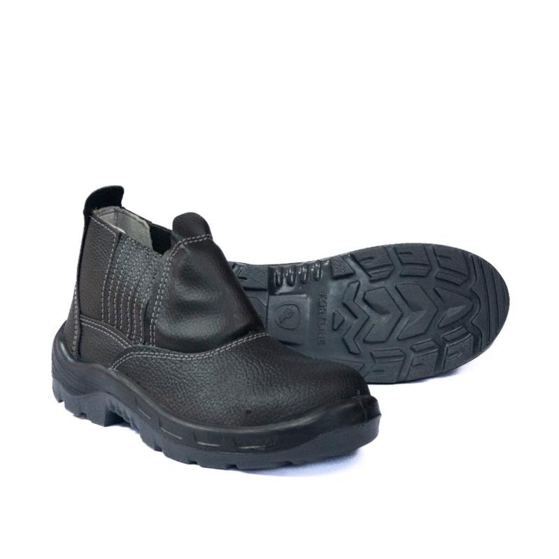 Calçado ocupacional de uso profissional tipo botina, fechamento em elástico nas laterais, confeccionado em couro, forro interno em não tecido, palmilha de montagem em não tecido fixada pelo sistema strobel, palmilha interna removível, biqueira plástica para conformação, solado de poliuretano bidensidade injetado direto no cabedal, resistente ao escorregamento e ao óleo combustível.