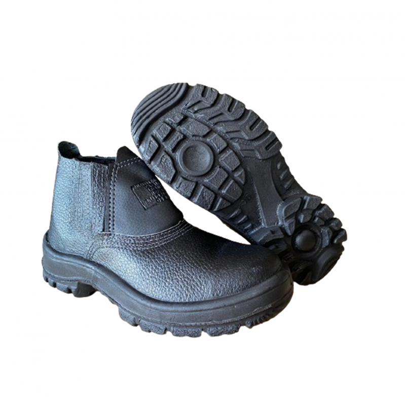 Calçado ocupacional tipo botina (desenho tipo B), fechamento em elástico, confeccionado em couro raspa na cor preta, palmilha de montagem em não tecido montada pelo sistema strobel, biqueira plástica para conformação, solado de poliuretano monodensidade na cor preta com ressaltos, resistente ao escorregamento.