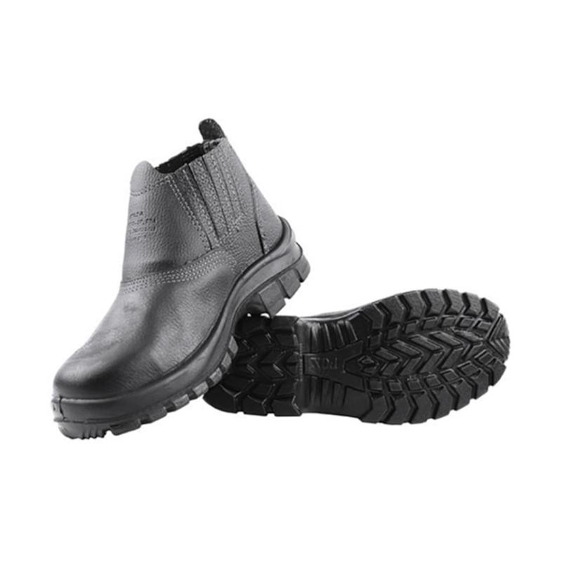 Calçado ocupacional tipo botina (desenho tipo B), fechamento em elástico, confeccionado em couro raspa na cor preta, palmilha de montagem em não tecido montada pelo sistema strobel, biqueira plástica para conformação, solado de poliuretano monodensidade na cor preta com ressaltos, resistente ao escorregamento.