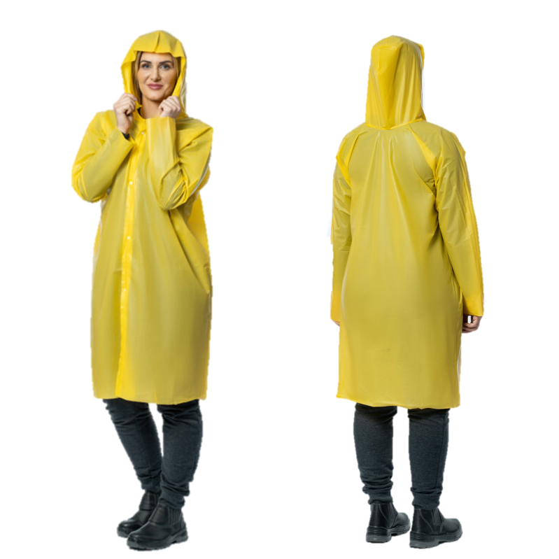 CConfeccionada em Etileno Acetato de Vinila (EVA) com cordão de poliéster no capuz e botões de pressão para abertura frontal e elástico nos punhos.