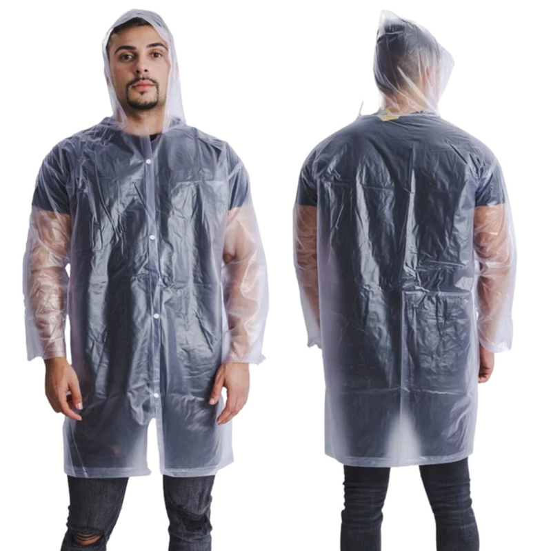 Confeccionada em PVC vinil laminado, mangas longas, capuz, costuras através de solda eletrônica, fechamento frontal com quatro botões de pressão plásticos.