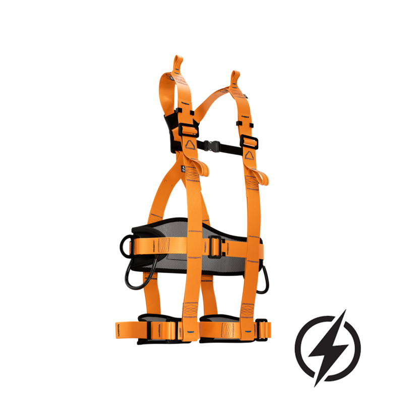 Possui 4 pontos de conexão ( Uma dorsal e duas lateral com argola em formatos "D" dielétrico, Duas alças em fita de poliéster retardante a chama, e um cinturão abdominal)