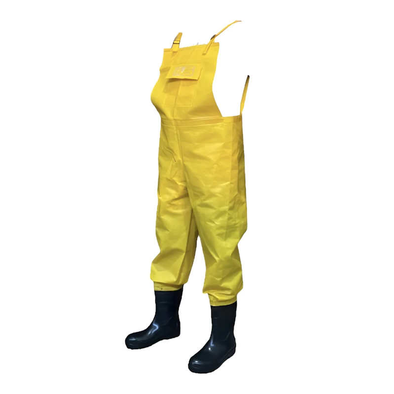 confeccionada em PVC (policloreto de vinila) dupla face com trama interna em fios de poliéster (trevira), suspensórios confeccionados no mesmo material, fivelas plásticas para regulagem e botas de PVC acopladas