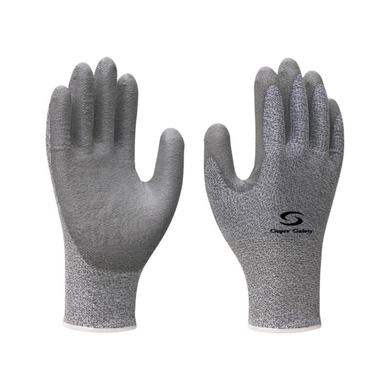 Luva de segurança tricotada em fibras sintéticas resistentes a corte com o punho em acabamento em overloque, revestimento emborracha PU na palma.