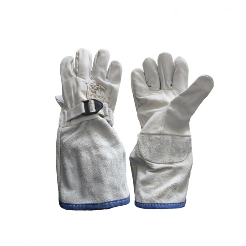 Luva vaqueta cobertura, é luva de segurança confeccionada com vaqueta curtida ao cromo, com formato de cinco dedos (forma L) com reforço na palma, reforço de costura entre polegar e indicador e entre dedos anelares.