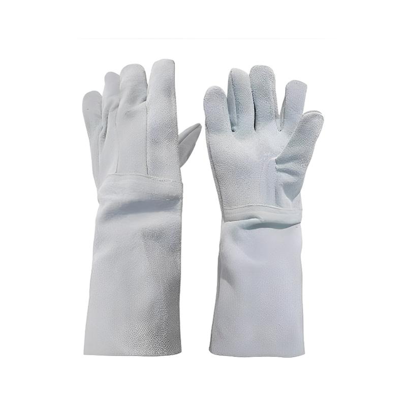 Luva de segurança confeccionado em couro raspa, com formato de cinco dedos, com reforço na palma, reforço na costura entre o polegar e o indicador e entre dedos anelares, acabamento em viés, costura com linha de nylon.