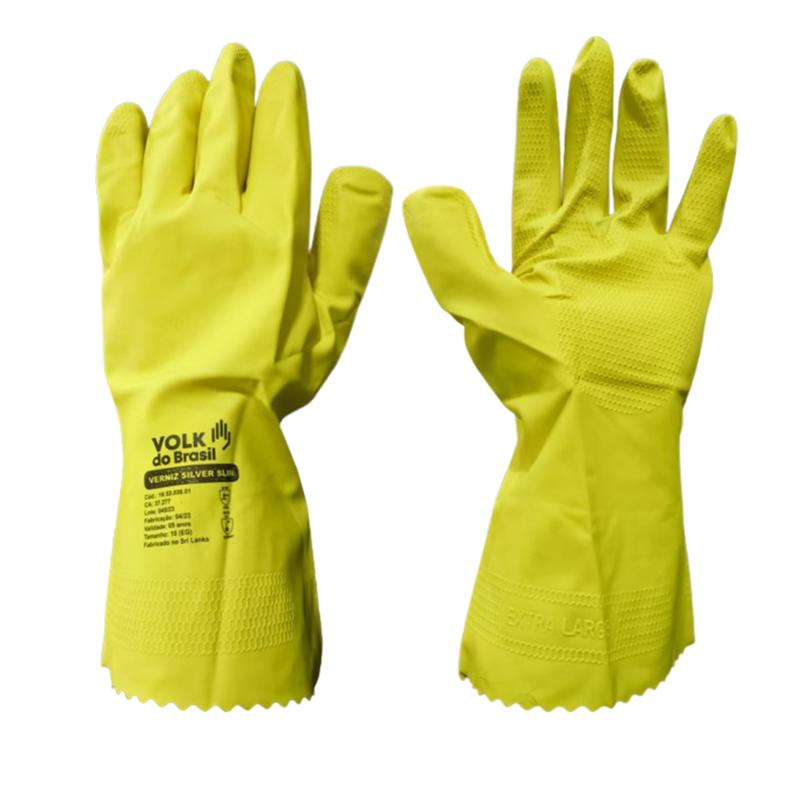 Luva de segurança confeccionada em látex natural, revestimento interno em verniz silver, relevo antiderrapante na face palmar e face palmar dos dedos.