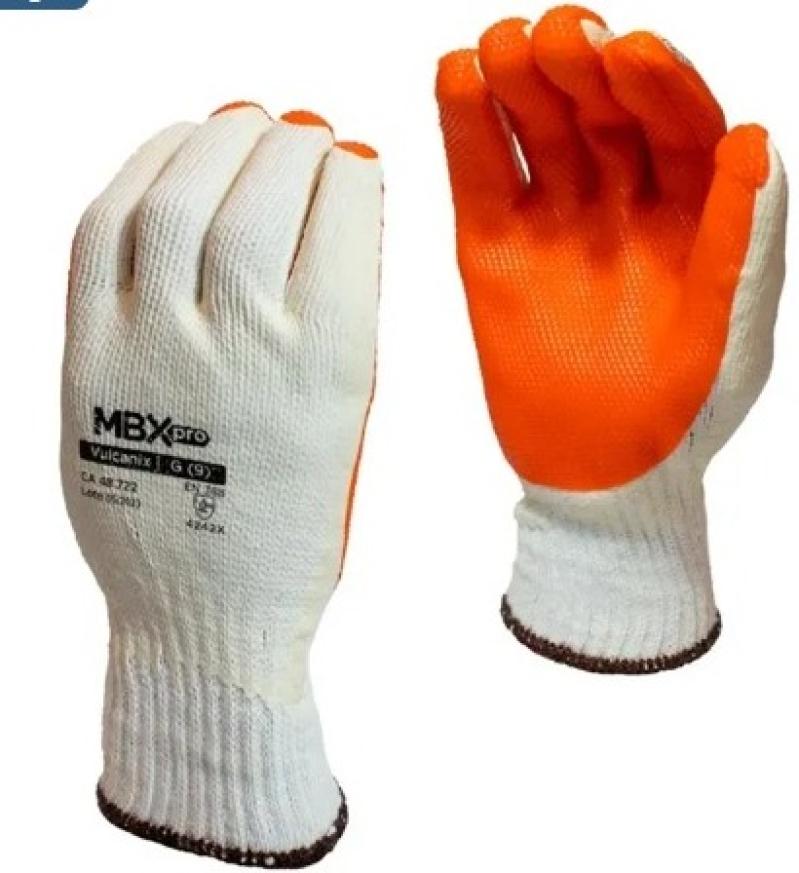 Luva de proteção, tricotada em algodão, poliéster e elastômero com revestimento antiderrapante vulcanizado, em formato de diamante, de látex natural na palma, face palmar dos dedos e ponta dos dedos (unheira), com reforço de borracha natural entre os dedos polegar e indicador (região da “pinça”).