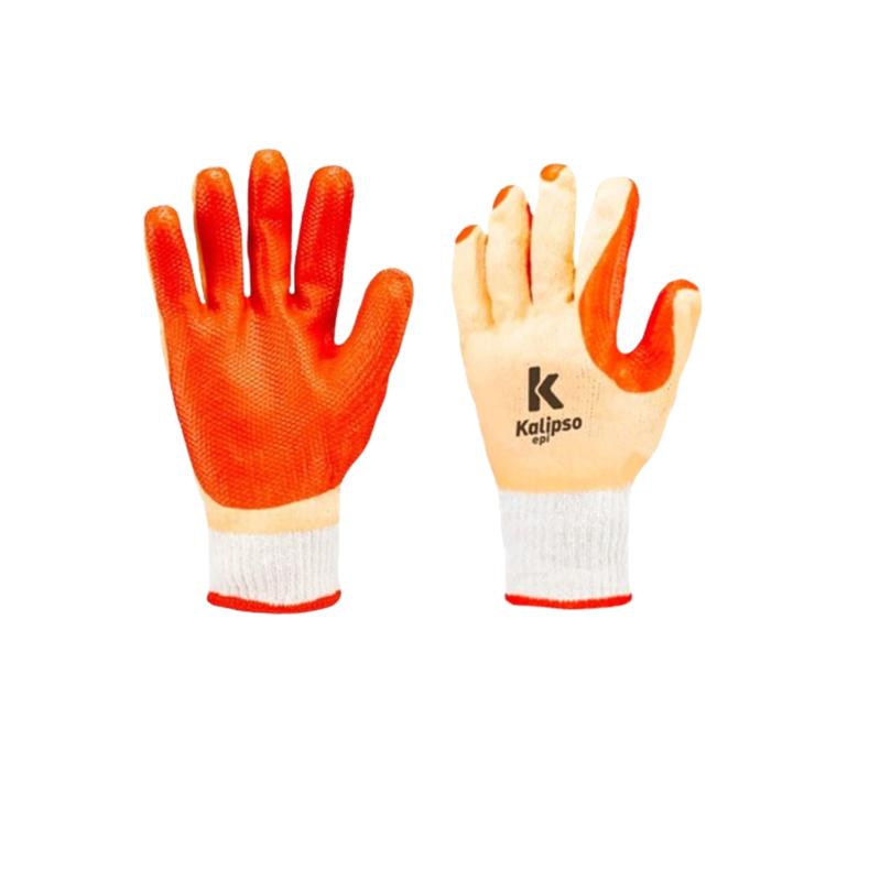 Luva de proteção, tricotada em algodão, poliéster e elastômero com revestimento antiderrapante vulcanizado, em formato de diamante, de látex natural na palma, face palmar dos dedos e ponta dos dedos (unheira), com reforço de borracha natural entre os dedos polegar e indicador (região da “pinça”).