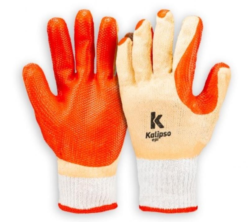 Luva de proteção, tricotada em algodão, poliéster e elastômero com revestimento antiderrapante vulcanizado, em formato de diamante, de látex natural na palma, face palmar dos dedos e ponta dos dedos (unheira), com reforço de borracha natural entre os dedos polegar e indicador (região da “pinça”). Punho