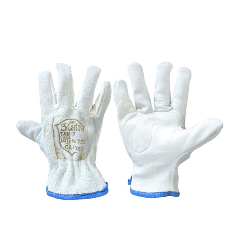Luva de segurança de cinco dedos, confeccionada no dorso em couro tipo raspa, na palma em couro tipo vaqueta, com reforço interno entre os dedos e acabamento em viés de TNT no punho.