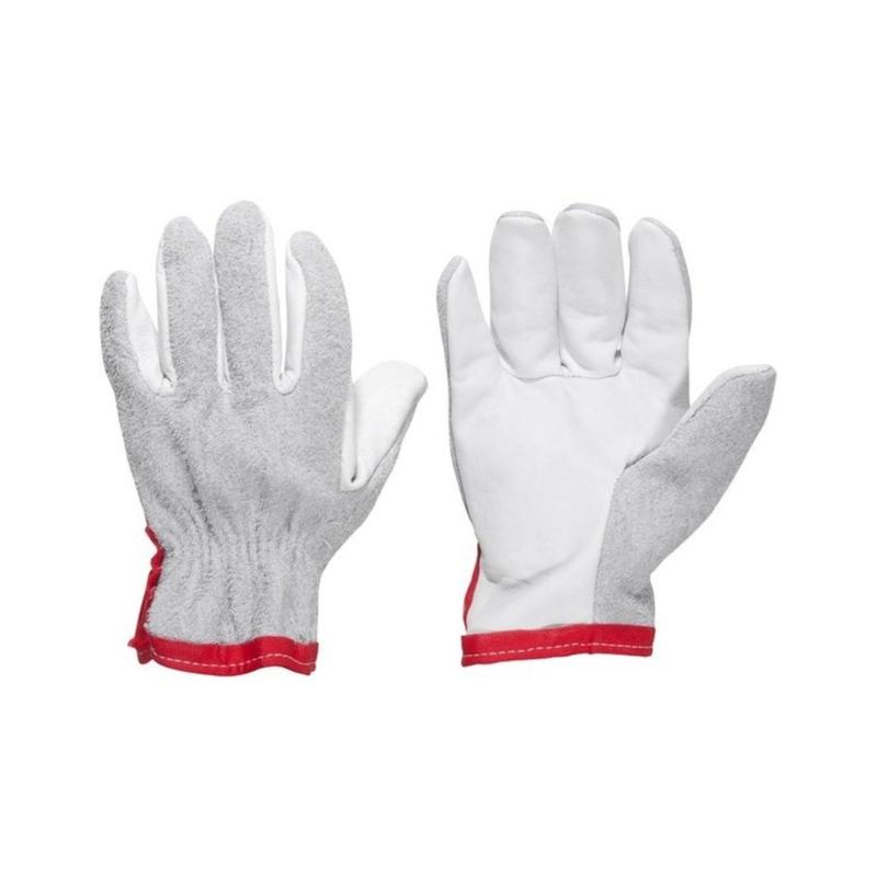 Luva de segurança de cinco dedos, confeccionada no dorso em couro tipo raspa, na palma em couro tipo vaqueta, com reforço interno entre os dedos e acabamento em viés de TNT no punho.