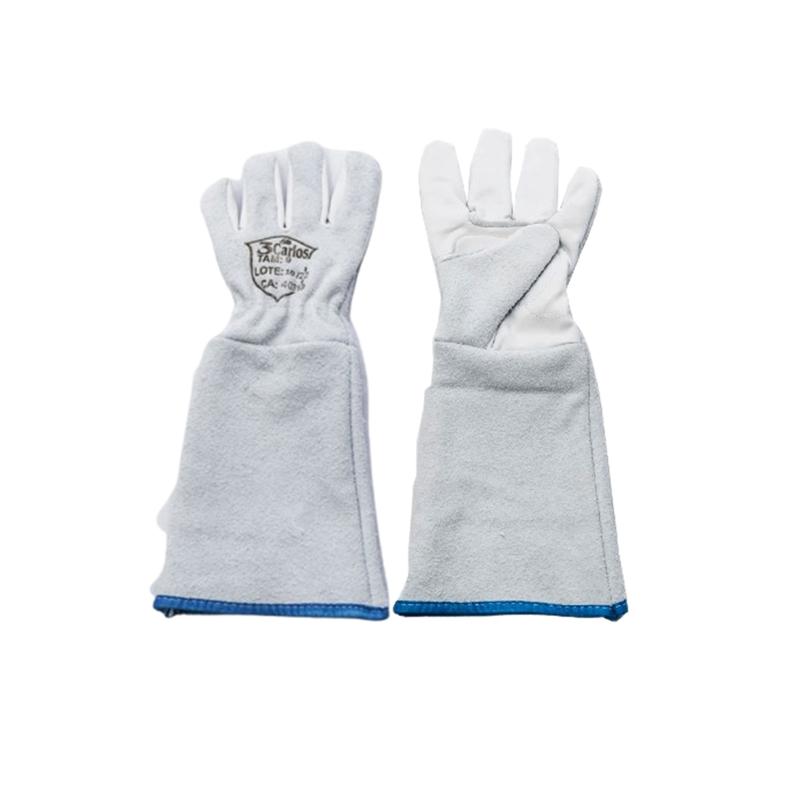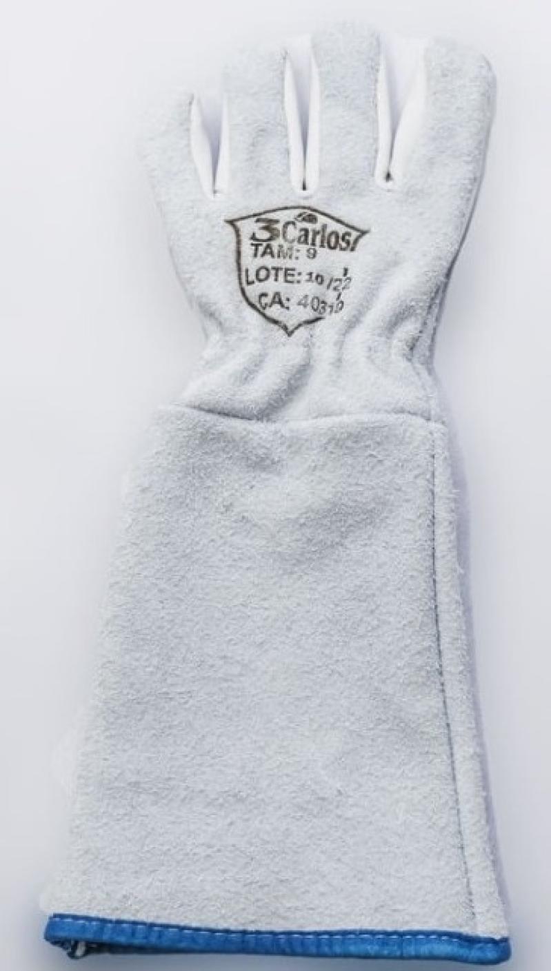 Luva de segurança confeccionado em vaqueta, na face palmar, dedos e face dorsal.Possui face dorsal com tira para ajuste; punho em raspa curtida ao protetor de artéria e costurada com linha de nylon. Aprovado para a proteção das mãos do usuário conta agentes abrasivos, escoriantes, cortantes e perfurantes.