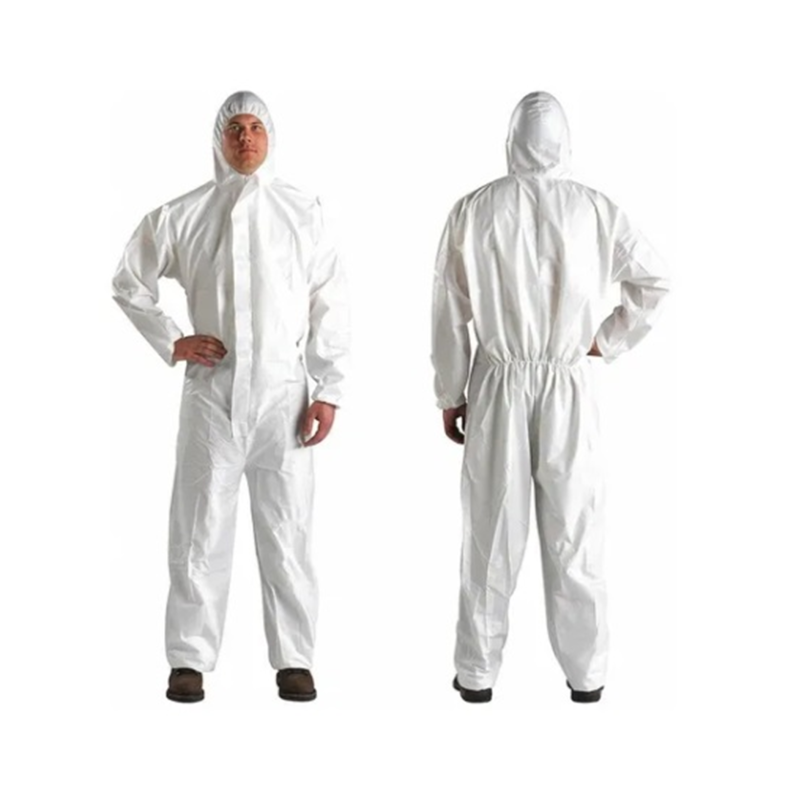 macacão de segurança confeccionado em nãotecido de filamentos em polipropileno (SMS), com reforço no mesmo material na região do tórax, abdômem, costas e mangas, fechamento frontal em zíper e aba protetora, elásticos na cintura, capuz, punhos e tornozelos