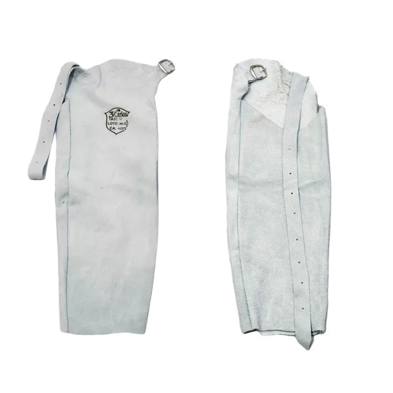 Mangote de segurança confeccionada em raspa, com tira de regulagem em raspa, fivela metálica, costura com linha de algodão, largura de 24 cm e comprimento total de 62 cm. Aprovado para proteção do braço e antebraço contra agentes abrasivos, escoriantes, cortantes e perfurantes.