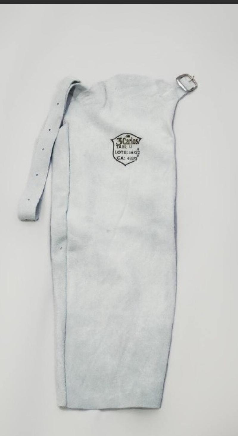 Mangote de segurança confeccionada em raspa, com tira de regulagem em raspa, fivela metálica, costura com linha de algodão, largura de 24 cm e comprimento total de 62 cm. Aprovado para proteção do braço e antebraço contra agentes abrasivos, escoriantes, cortantes e perfurantes.
