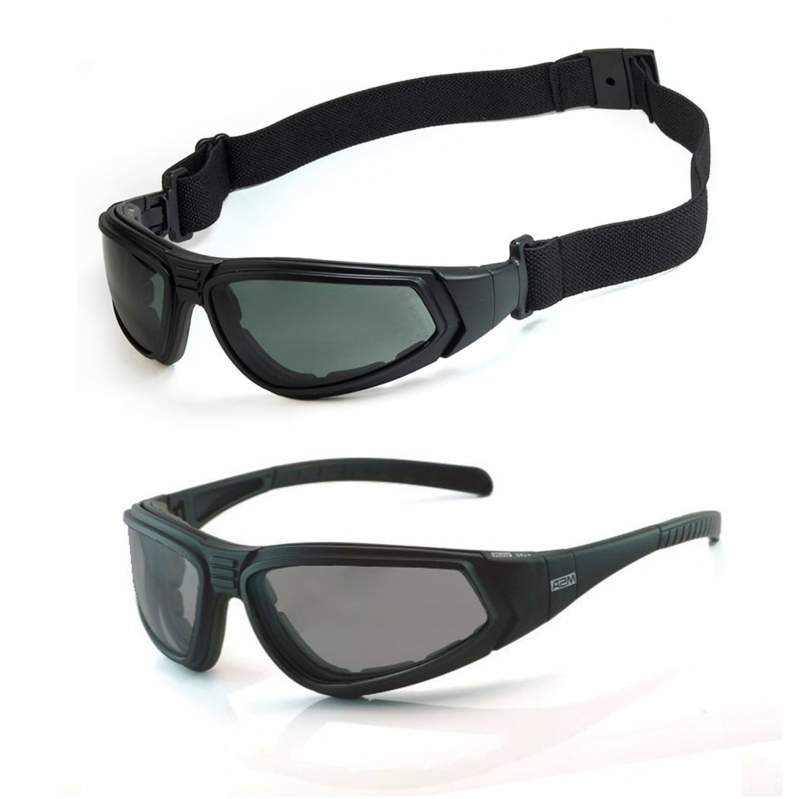 Armação confeccionada em poliamida preta com revestimento na parte interna em espuma cinza escuro, com lentes confeccionadas em policarbonato. O ajuste à face do usuário pode ser feito através de tirante elástico preto e hastes tipo espátula.